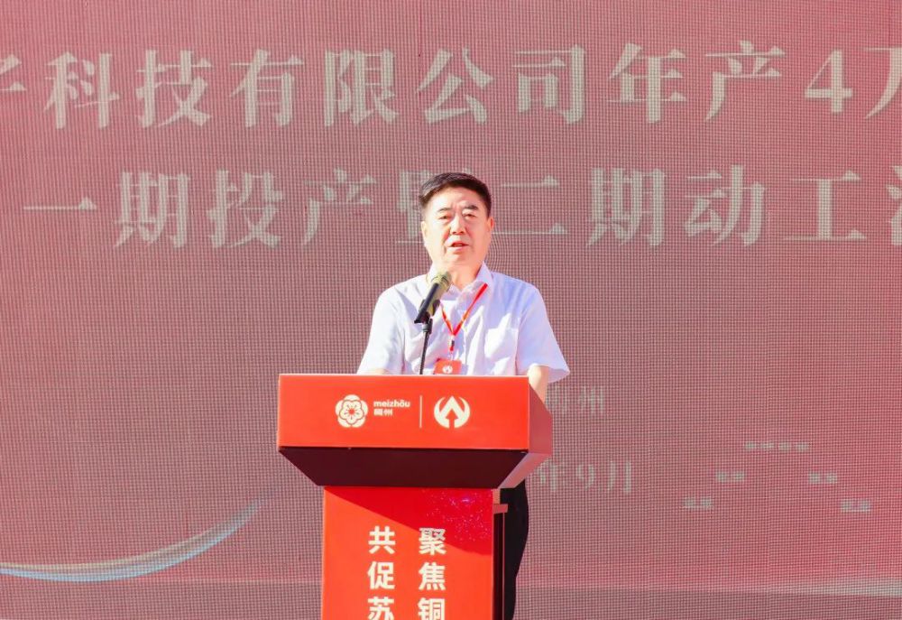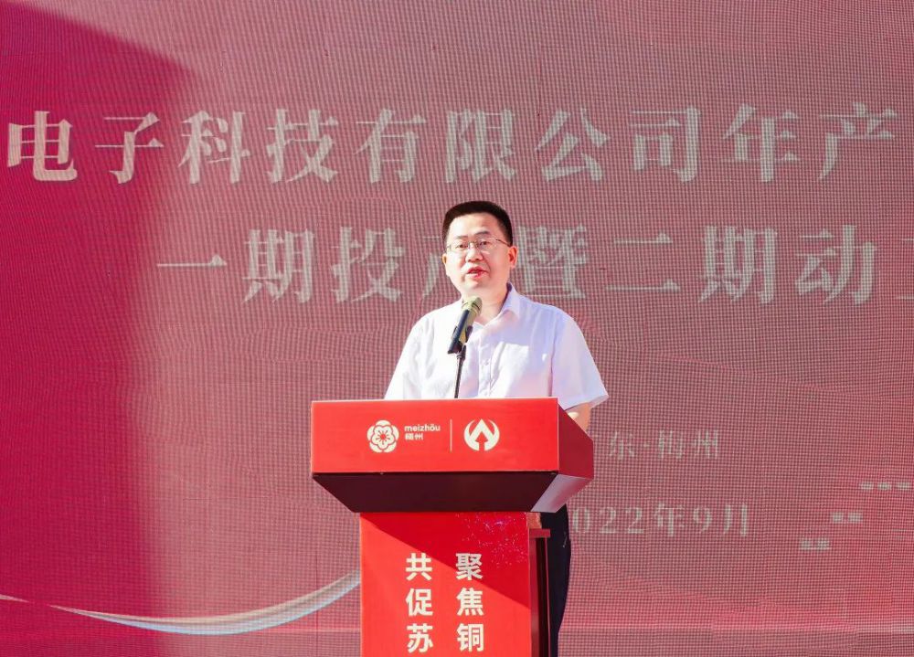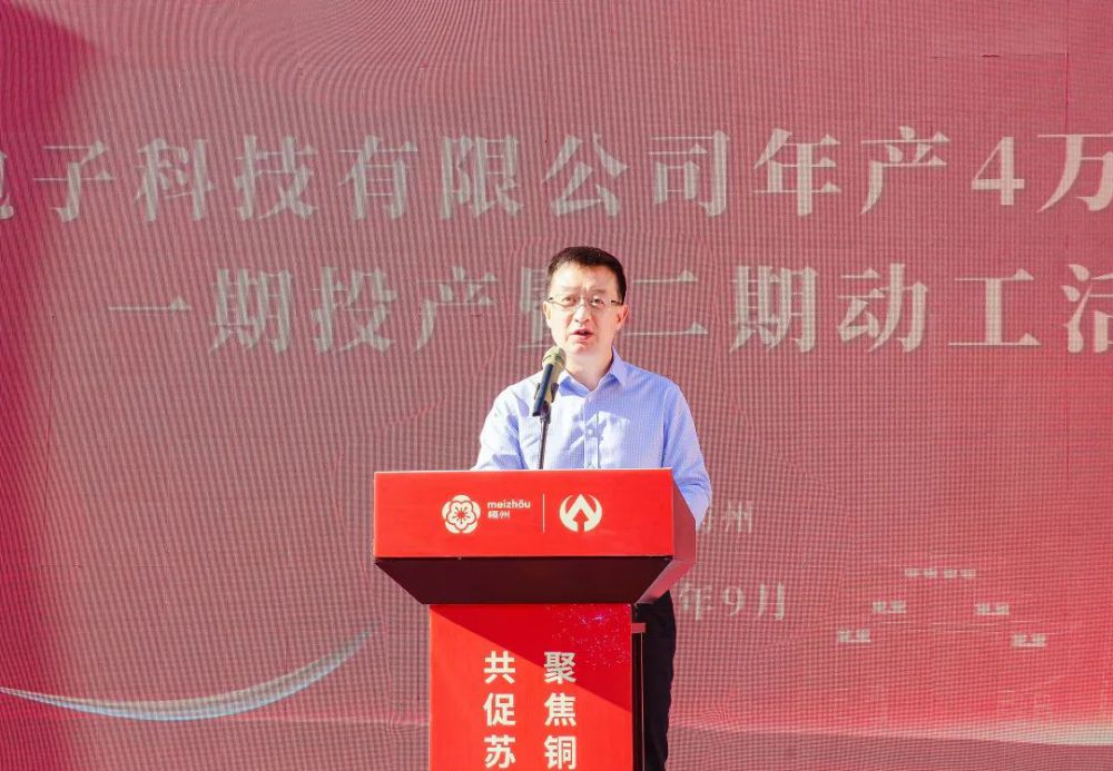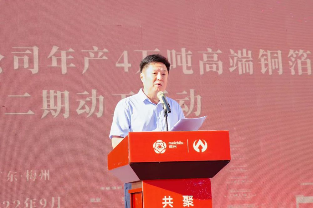 梅州市委常委、副市長、梅江區委書記陳金鑾代表市委市政府致辭,向廣東盈華電子科技有限公司高端銅箔項目一期投產暨二期動工表示熱烈的祝賀。他表示,盈華高端銅箔項目是我市重點“打糧食”項目之一,自項目啟動以來,拿地即動工,一年即投產,跑出了重點項目落地的加速度,這是貫徹落實習近平總書記“疫情要防住,經濟要穩住,發展要安全”重要指示要求的生動實踐。項目的投產將進一步壯大梅江信息產業集群,助力梅州加快打造“中國銅箔之都”。他強調,市直有關部門要用心用情優服務,突出抓好項目審批全面提速、惠企政策精準落地、營商環境持續優化;深化“暖企”行動,為企業發展和項目建設“鋪路架橋”,用政府的誠信贏取企業家的信心、用干部的“辛苦指數”換取企業的“發展指數”。希望盈華科技堅定發展信心,爭取早日實現一期滿產滿銷及加快二期建成投產,為推動梅州蘇區加快振興、共同富裕貢獻力量。