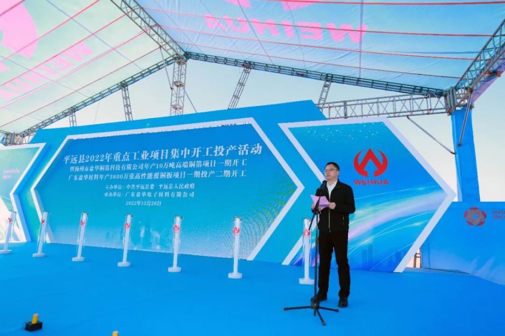 平遠縣委副書記、縣長周小勇代表縣委縣政府致辭,對出席活動的領導和嘉賓致以了最衷心的感謝和最崇高的敬意,對盈華銅箔科技年產10萬噸高端銅箔項目一期動工致以了最熱烈的祝賀。周小勇表示沒有等出來的輝煌,只有干出來的精彩,平遠縣委縣政府深入貫徹落實中央和省市關于穩(wěn)住經濟大盤的各項決策部署,堅持把發(fā)展經濟的著力點放在實體經濟上,把工業(yè)項目尤其制造業(yè)項目作為推動高質量發(fā)展的重要抓手,全力以赴抓項目、促投資、穩(wěn)增長。盈華銅箔科技等一批開工、投產的項目,涵蓋多個先進制造領域,項目全部達產后,必將點燃平遠高質量發(fā)展“新引擎”,增添紅色蘇區(qū)綠色發(fā)展新動能。