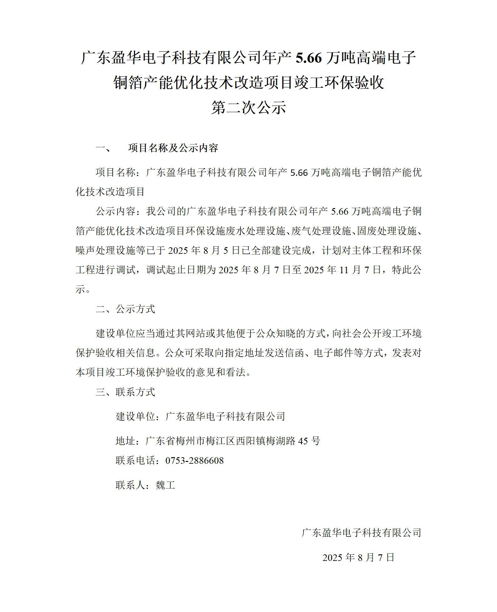 廣東盈華電子科技有限公司年產5.66萬噸高端電子銅箔產能優化技術改造項目竣工環保驗收第二次公示
